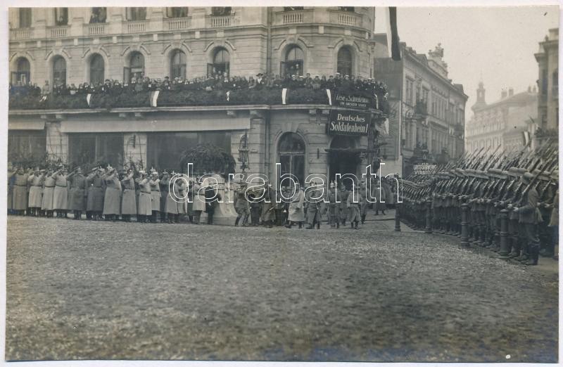 1918 Bucharest, Bukarest, Bucuresti, Bucuresci; Ankunft des Generalfedlmarschalls von Mackensen vor der Hauptwache, Deutsches Soldatenheim I / One day after the preliminary peace treaty, arrival of Field Marshal von Mackensen, German occupation. photo