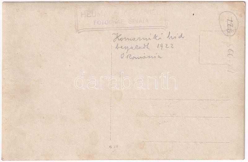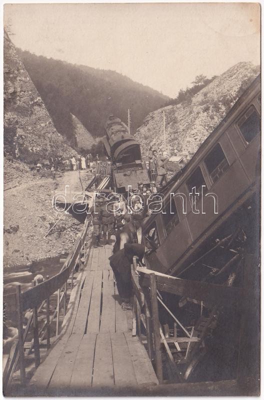 1922 Comarnic, Komarnik; accident feroviar / beszakadt vasúti híd a leesett vonatszerelvényekkel / collapsed railway bridge with fallen train. Heumann & Daniel Fotograf Sinaia, photo