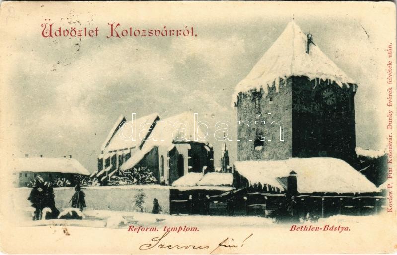 1898 (Vorläufer) Kolozsvár, Cluj; Református templom és Bethlen bástya télen. Kovács P. fiai kiadása, Dunky fivérek felvételei után / Calvinist church and castle tower in winter, bastion (EK)