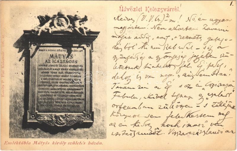 1904 Kolozsvár, Cluj; Emléktábla Mátyás király születés házán. Kováts P. Fiai 126. sz. / memorial plaque for Mathias Rex on the wall outside of his birthplace, King Matthias monument