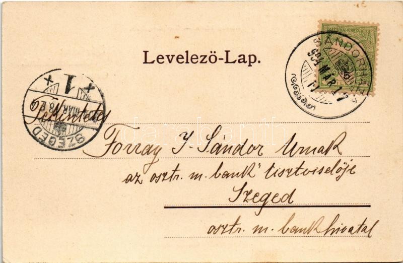 1904 Sándorháza, Sandra; Községi iskola, Római katolikus templom, községháza, nagy vendéglő / school, church, town hall, restaurant. Art Nouveau, floral