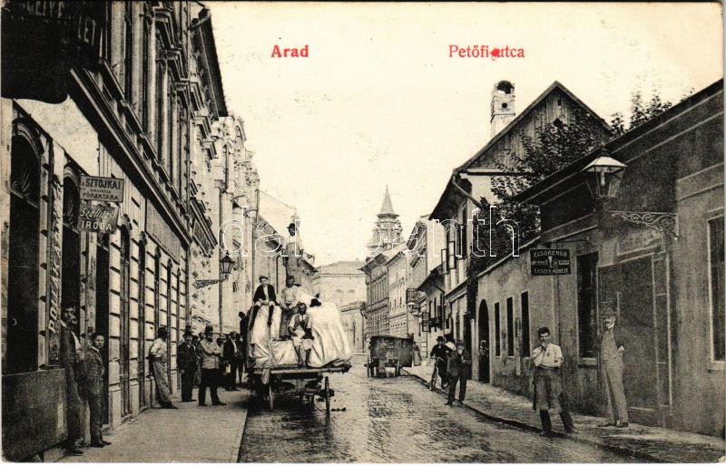 1908 Arad, Petőfi utca, Elsőrendű arany és ezüst ékszerműhely, A Sztojkai ásványvíz főraktára és szállítási iroda, megpakolt szekéren pózoló munkások / jewelry workshop, mineral water main warehouse and transport office, fully loaded cart