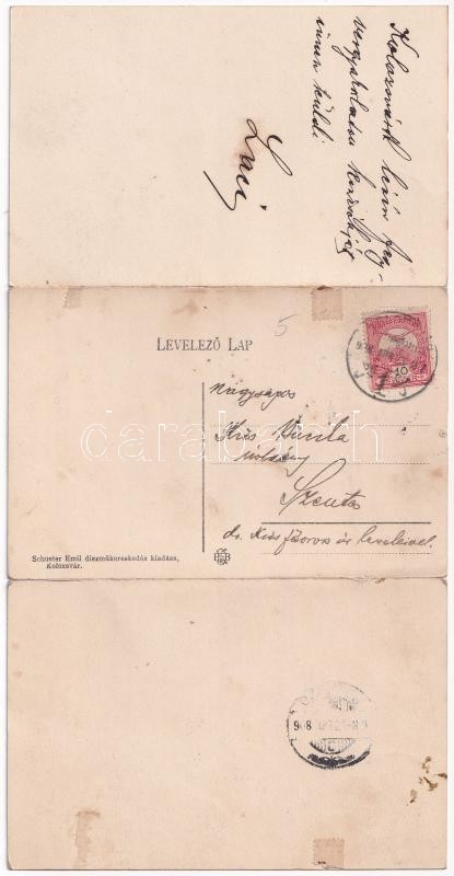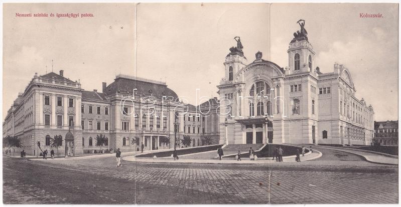 1908 Kolozsvár, Cluj; Nemzeti színház és igazságügyi palota. Schuster Emil három részes kihajtható panorámalapja / theatre, financial palace. 3-tiled folding panoramcard (fl)