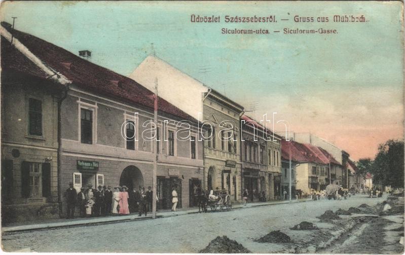 1912 Szászsebes, Mühlbach, Sebesul Sasesc, Sebes; Siculorum utca, Wach... https://www.darabanth.com/de/36-Gross-Auktion/36.1/Ansichtskarten/Siebenburgen~15418/1912-Szaszsebes-Muhlbach-Sebesul-Sasesc-Sebes-Siculorum-utca-Wachsmann-Duck-huscsarnok-G~II2476132