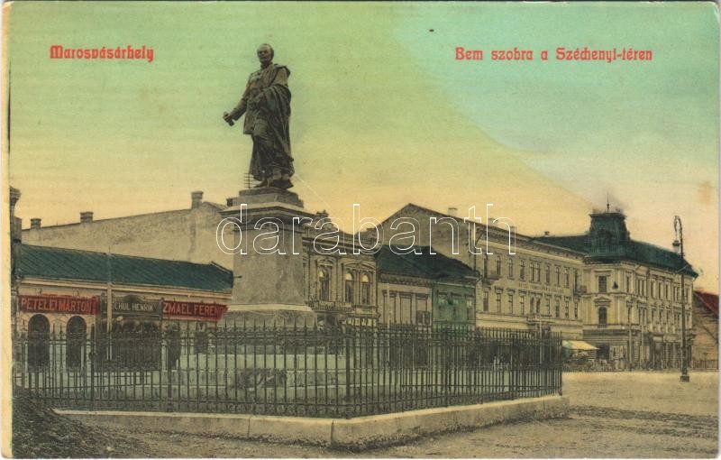 1913 Marosvásárhely, Targu Mures; Bem szobor a Széchenyi téren, Petelei Márton, Schul Henrik, Zmael Ferenc üzlete, Transilvania és Központi szálloda / statue, square, shops, hotels + "KÜKÜLLŐSZÉPLAK POSTAI ÜGYN."