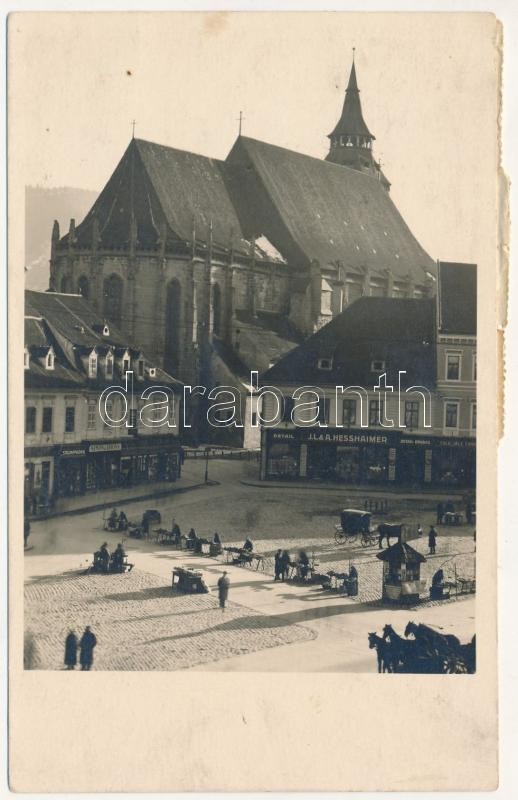 1935 Brassó, Kronstadt, Brasov; Piac, Detail Engros, Karl Essigmann, Simon & Gross, Strumpfkönig, Coloniale Engros, J.L. & A. Hesshaimer üzletek / market on the main square, shops. Atelier O. Netoliczka photo