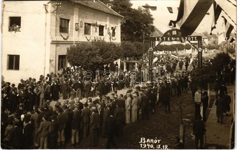 1940 Barót, Baraolt; bevonulás, "Isten hozott" feliratú dísz... https://www.darabanth.com/de/36-Gross-Auktion/36.1/Ansichtskarten/Siebenburgen~15418/1940-Barot-Baraolt-bevonulas-Isten-hozott-feliratu-diszkapuval-entry-of-the-Hungarian-tro~II2486132