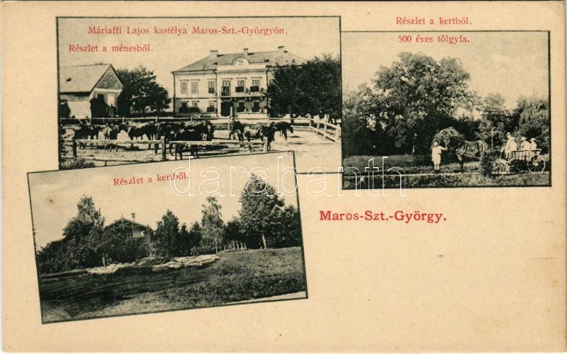 Marosszentgyörgy, Sangeorgiu de Mures, Sangeorgiul-Roman; Máriaffi Lajos kastélya, ménes, kert, 500 éves tölgyfa / castle, stud farm, garden, 500 years old oak tree