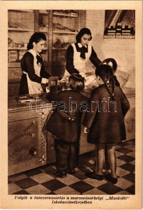Marosvásárhely, Targu Mures; Folyik a tanszervásárlás a Muskátli Iskolaszövetkezetben. Erdélyrészi Hangya Szövetkezet kiadása, reklám / buying school tools in the School Cooperative, interior
