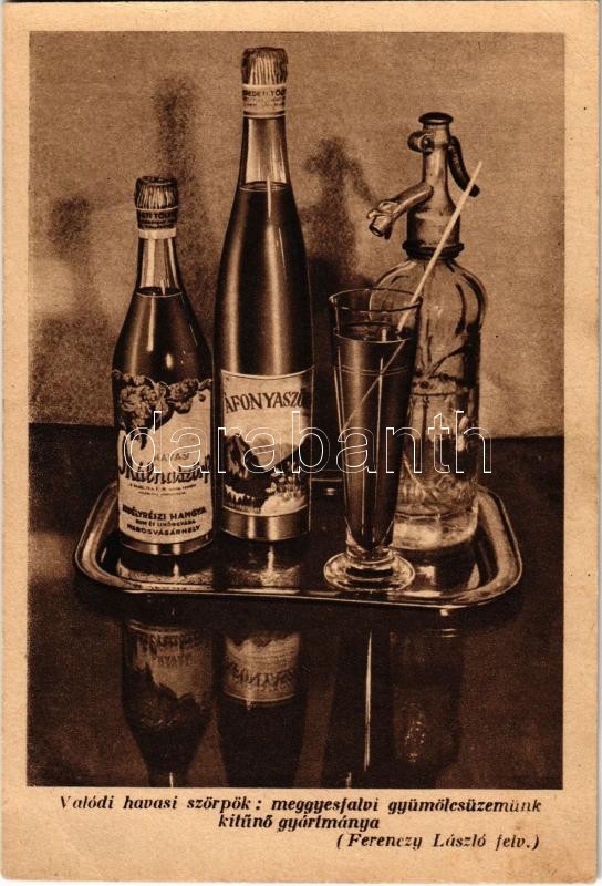 Meggyesfalva, Mureseni; Valódi havasi szörpök. A meggyesfalvi gyümölcsüzem kitűnő gyártmánya. Erdélyrészi Hangya Szövetkezet kiadása, Ferenczy László felvétele, reklám / Transylvanian fruit syrups from the fruit processing plant of Mureseni