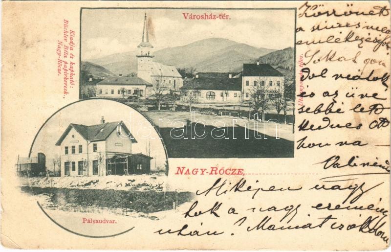 Beschreibung: 1901 Nagyrőce, Gross-Rauschenbach, Velká Revúca; Városház tér, pályaudvar, vasútállomás. Büchler Béla kiadása / railway station, town hall, square (EK)
