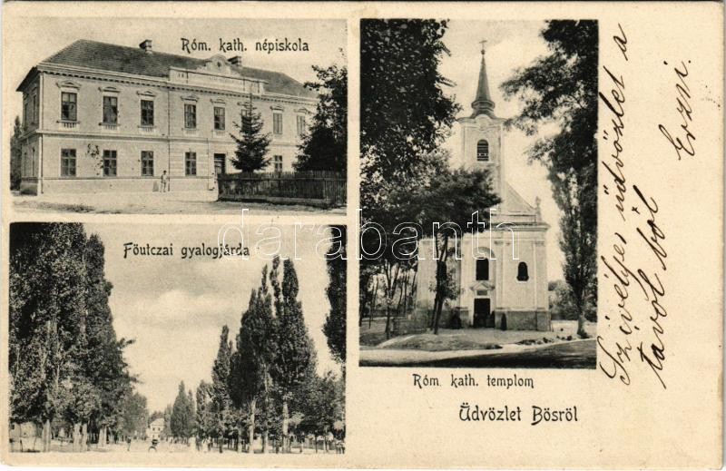 Beschreibung: 1906 Bős, Böős, Bes, Gabcikovo; Római katolikus népiskola és templom, Fő utca gyalogjárda / school and church, main street (Rb)