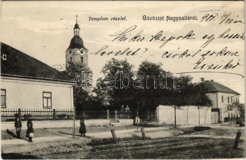 Beschreibung: 1908 Nagysalló, Tekovské Luzany, Tekovské Sarluhy; templom, utca / church, street