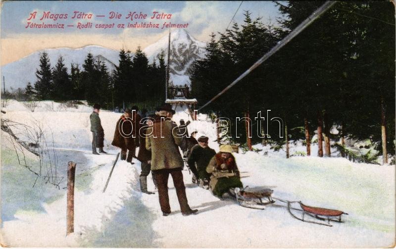 1916 Tátralomnic, Tatranská Lomnica ( Magas Tátra, Vysoké Tatry); Rodli csapat az induláshoz felmenet, téli sport, szánkózók / winter sport, sleigh race, sledding (Rb)