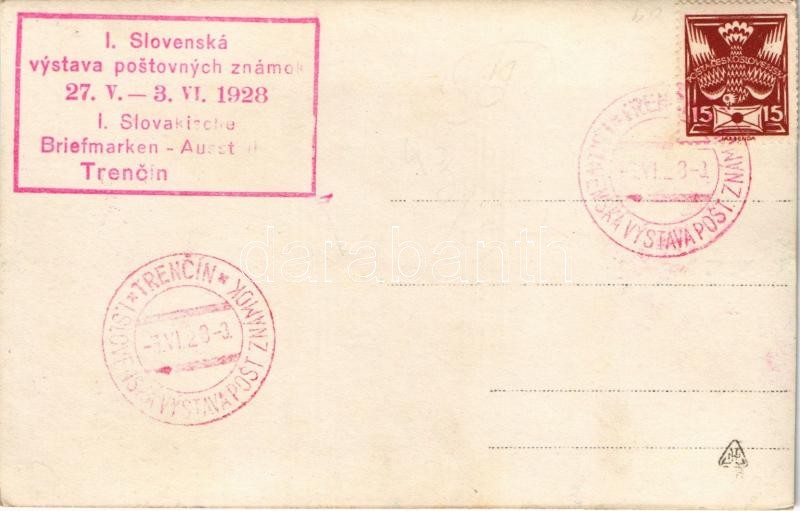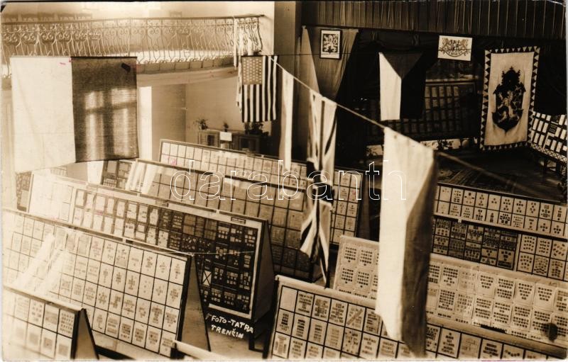 1928 Trencsén, Trencín; I. Slovenská vystava postovnych známok / I. Slovakische Briefmarken-Ausstellung / Első Szlovák Bélyegkiállítás, terem belső, zászlók, címer / 1st Slovak Philatelic Exhibition, room interior with flags, coat of arms, stamps. Foto Tatra photo + "I. Slovenská vystava postovnych známok 27. V. - 3. VI. 1928 I. Slovakische Briefmarken-Ausstellung Trencín CSR" So. Stpl.