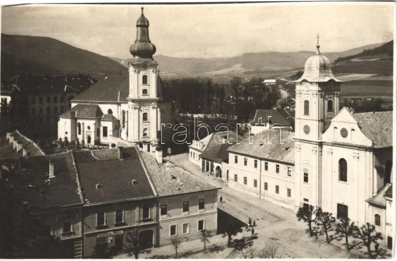 Beschreibung: 1933 Rozsnyó, Roznava; utca, templomok, Nagybani dohányeladás üzlete / street, churches, tobacco shop