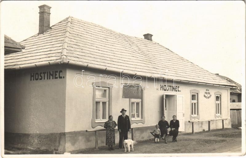 1938 Alsóterény, Dolné Terany (Terény, Terany, Teszér, Hontianske Tesáry); Vendéglő, Németh Vince férfi szabó, sör, bor és szeszes italok mérése / Hostinec, Výčap piva vina a liehových nápojov, muzsky krajcír / restaurant, tailor's shop. Fotograf Mares, Krupina, photo