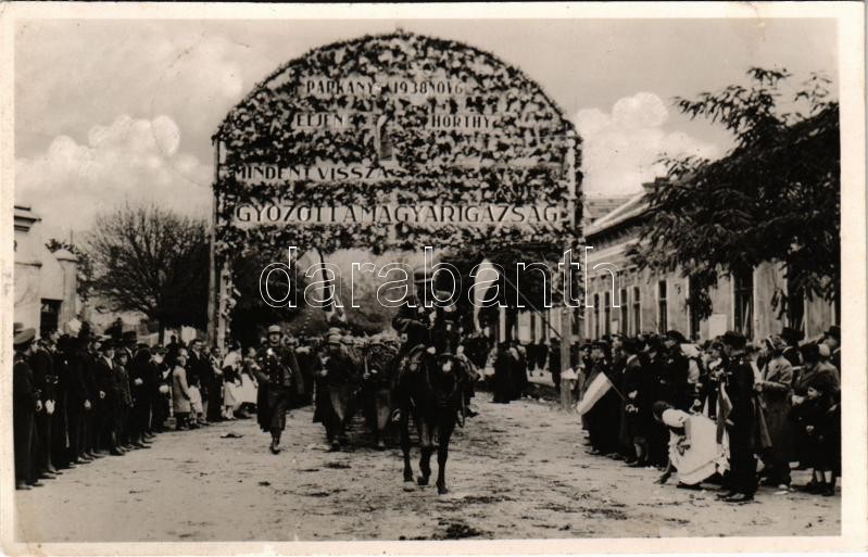 1938 Párkány, Stúrovo; bevonulás, "Éljen Horthy! Mindent vissza! Győzött Magyarország!" díszkapu, magyar zászló / entry of the Hungarian troops, decorated gate, Hungarian flag