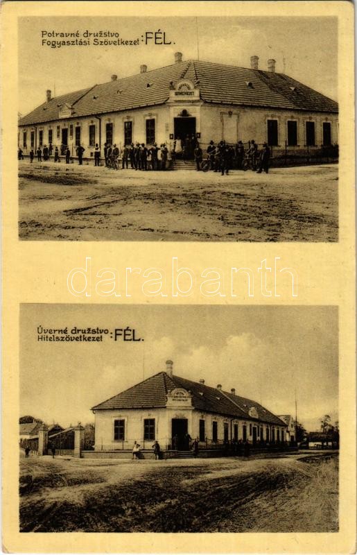 Beschreibung: 1941 Fél, Feilendorf, Tomasov; Hitelszövetkezet, Fogyasztási szövetkezet üzlete. Otto Brunner kiadása / credit union, cooperative shop (Rb)