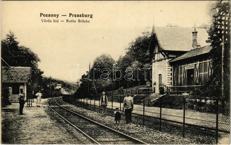 Beschreibung: Pozsony, Pressburg, Bratislava; Vörös híd, Vöröshíd vasútállomás a 28-as számú bakterházzal / Rothe Brücke / Zelezná Studienka railway station