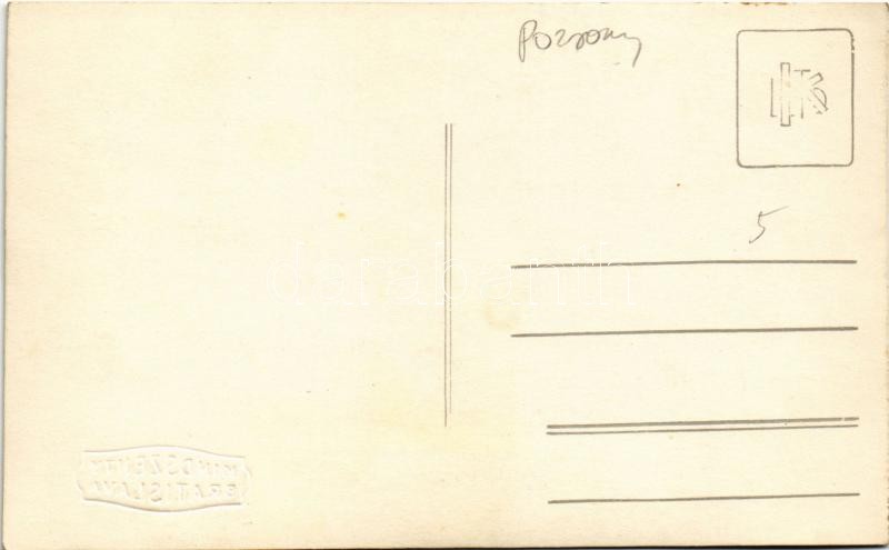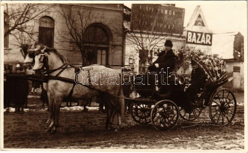 Pozsony, Pressburg, Bratislava; téli utcakép virágokkal feldíszített lovashintóval, könyvnyomda, könyvkötészet és papíráruház a háttérben, bazár / winter, horse chariot decorated with flowers, book binding and printing shop. Mindszenty photo
