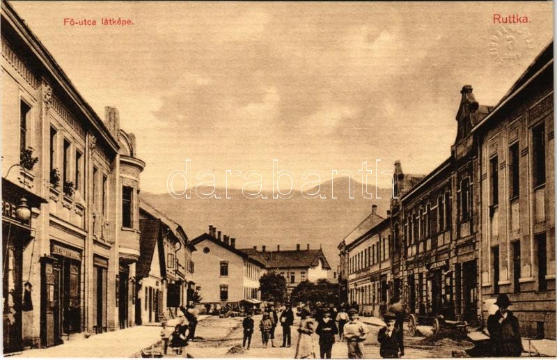 Beschreibung: Ruttka, Vrútky; Fő utca, piac, Szétsényi Ferenc üzlete. Felvidéki Magyarság nyomda, Gerő Henrik kiadása / main street, market, shops