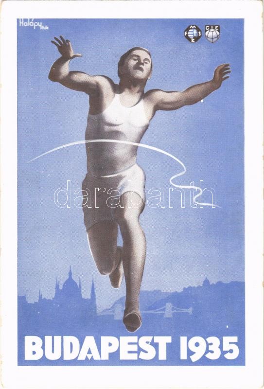 1935 Budapest VI. Főiskolai Világbajnokság reklámlapja. Magyar Főiskolai Sportegyletek Egyesülése kiadása / Hungarian College Sports Championship s: Halápy Ede + So. Stpl (EK)