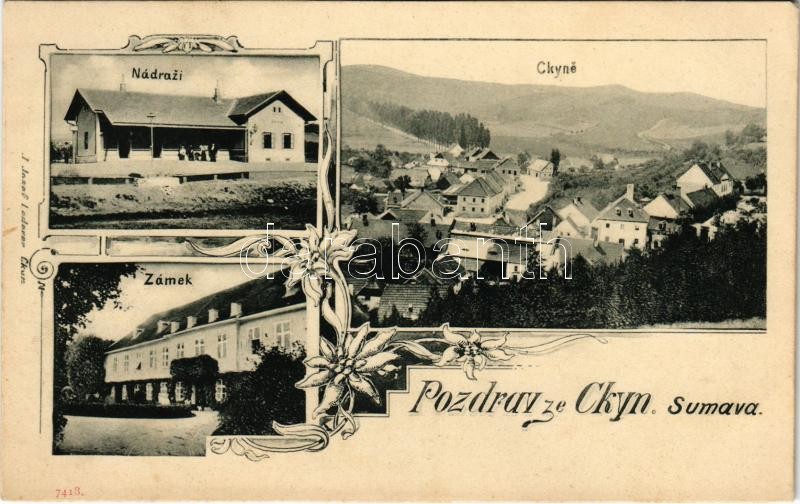 Ckyne (Sumava), Nádrazi, Zámek / railway station, castle. Art Nouveau,... https://www.darabanth.com/de/36-Gross-Auktion/36.1/Ansichtskarten/Tschechische-Republik~15439/Ckyne-Sumava-Nadrazi-Zamek-railway-station-castle-Art-Nouveau-floral~II2486576