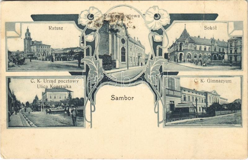 Sambir, Szambir, Sambor; Ratusz, Sokól, C.K. Gimnazyum, C.K. Urzad pocztowy, Ulica Kopernika, rada powiatowa / town hall, school, street, post office, county hall. Art Nouveau (fa)