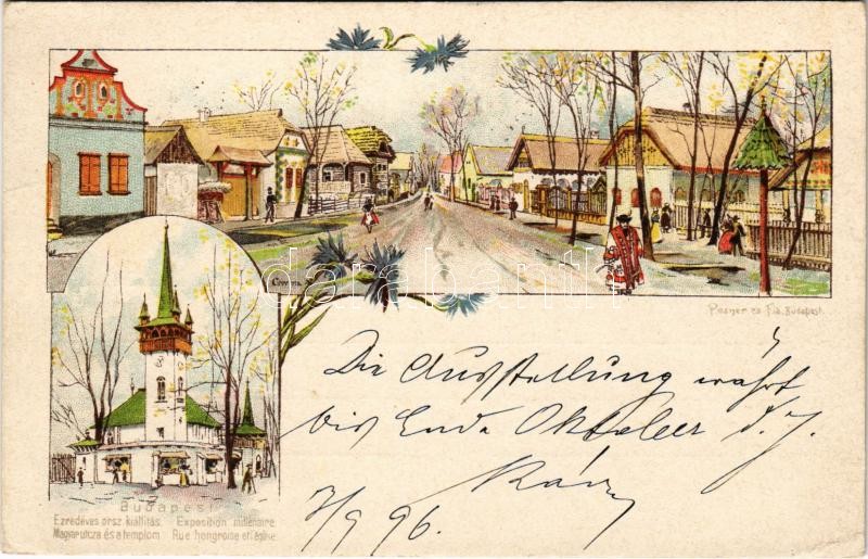 Beschreibung: 1896 (Vorläufer) Budapest XIV. Városliget, Ezredéves Országos Kiállítás, Magyar utca és a templom, Posner és Fia, litho barna 2 Kr. Ga. s: Cserna