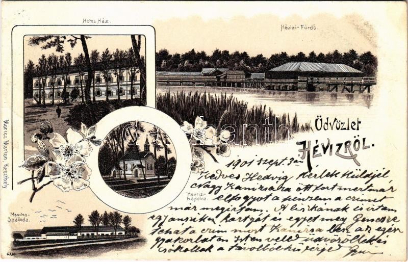 1901 Hévíz, Hetes Ház, fürdő, Mexikó szálloda, kápolna. Moricz Marton ... https://www.darabanth.com/de/36-Gross-Auktion/36.1/Ansichtskarten/Ungarn~15417/1901-Heviz-Hetes-Haz-furdo-Mexiko-szalloda-kapolna-Moricz-Marton-kiadasa-Art-Nouveau-~II2488142