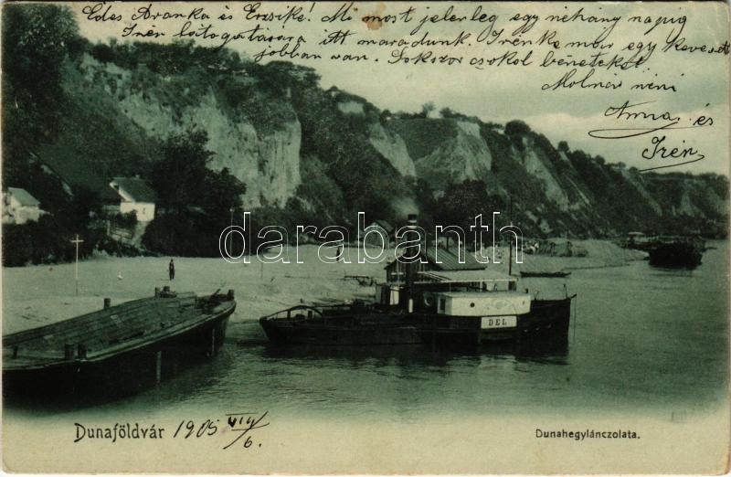 1905 Dunaföldvár, Duna hegyláncolata, "DÉL" oldalkerekes von... https://www.darabanth.com/de/36-Gross-Auktion/36.1/Ansichtskarten/Ungarn~15417/1905-Dunafoldvar-Duna-hegylancolata-DEL-oldalkerekes-vontato-gozhajo-Somlo-Mano-kiada~II2483061
