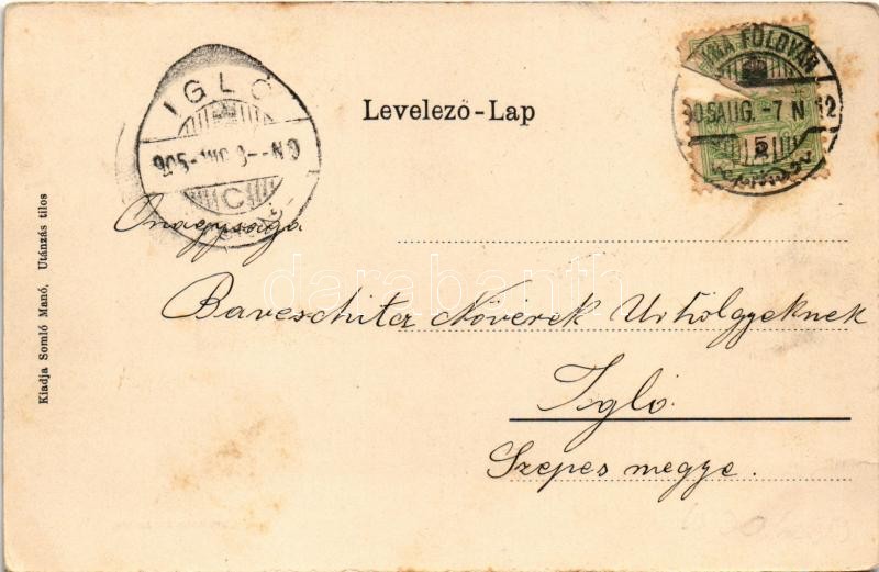 Beschreibung: 1905 Dunaföldvár, Duna hegyláncolata, "DÉL" oldalkerekes vontató gőzhajó. Somló Manó kiadása