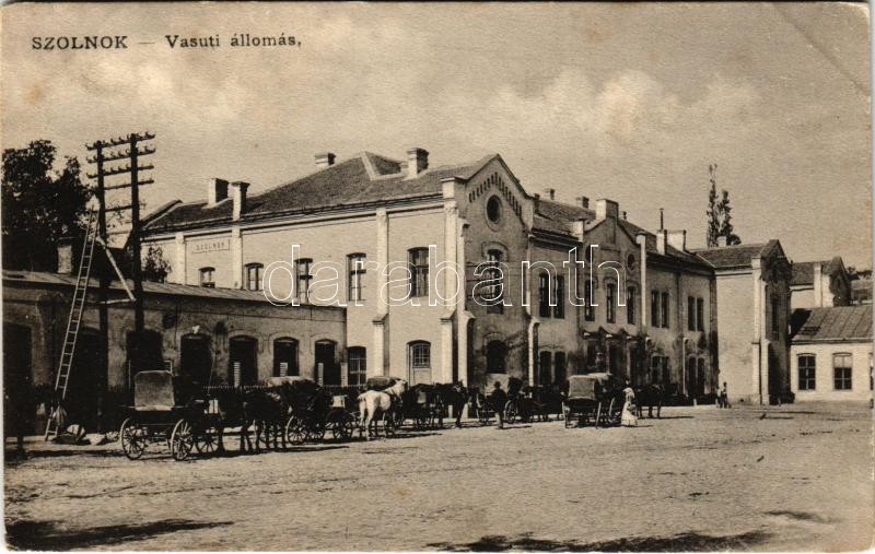 Beschreibung: 1906 Szolnok, Vasútállomás, lovashintók, létra a villanyoszlopnál. Róth Dezső (Rb)