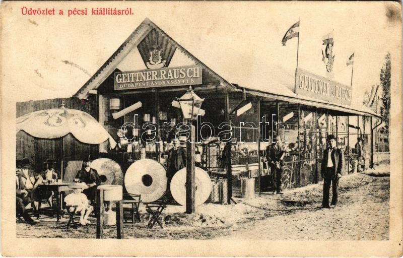 1907 Pécs, Országos Kiállítás, Geittner és Rausch vaskereskedő pavilon... https://www.darabanth.com/de/36-Gross-Auktion/36.1/Ansichtskarten/Ungarn~15417/1907-Pecs-Orszagos-Kiallitas-Geittner-es-Rausch-vaskereskedo-pavilonja-Budapest-Andrassy~II2483289