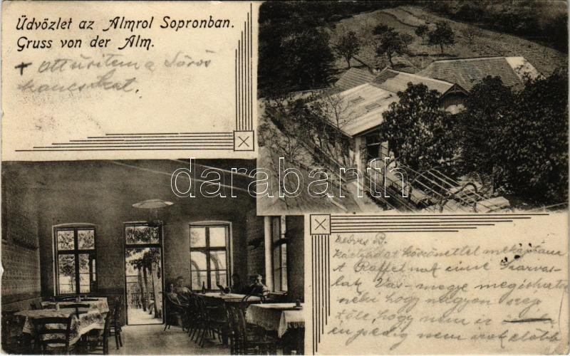 1908 Sopron, Üdvözlet az Almról, vendéglő belső. Art Nouveau (EK) https://www.darabanth.com/de/36-Gross-Auktion/36.1/Ansichtskarten/Ungarn~15417/1908-Sopron-Udvozlet-az-Almrol-vendeglo-belso-Art-Nouveau-EK~II2488076