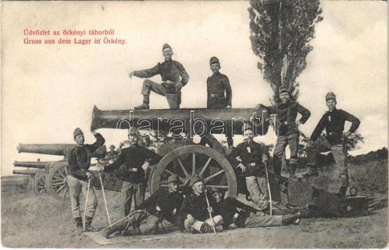1909 Örkény-Tábor, katonai üdvözlet ágyún pózolva https://www.darabanth.com/de/36-Gross-Auktion/36.1/Ansichtskarten/Ungarn~15417/1909-Orkeny-Tabor-katonai-udvozlet-agyun-pozolva~II2491585