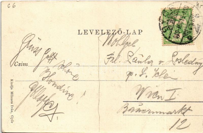 Beschreibung: 1910 Győr, Rákóczy utca, Arrabona Első Győri Temetkezési Válllalat, gyógyszertár. Milanes Iván kiadása