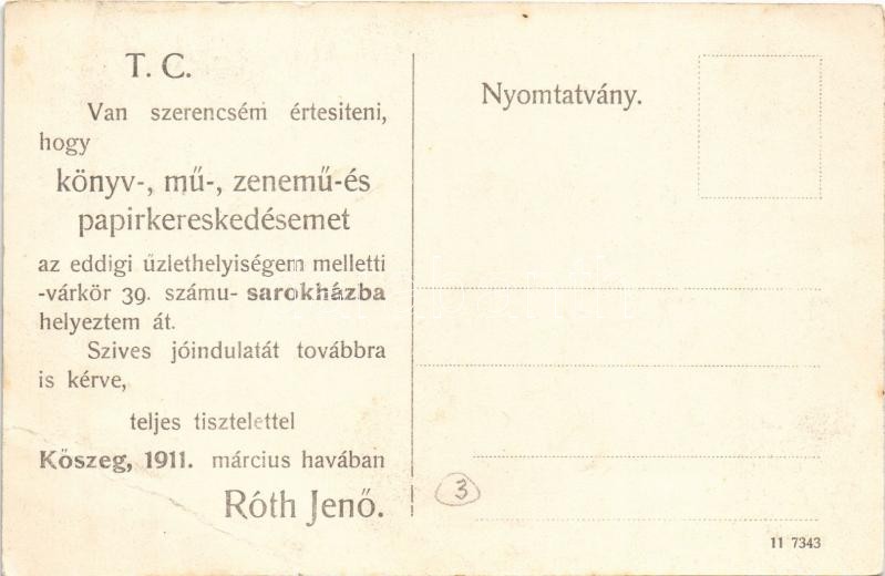 Beschreibung: 1911 Kőszeg, Róth Jenő könyv-, mű-, zenemű- és papírkereskedés, Decker fodrász üzlete. Hátoldalon reklám és értesítés költözésről (EB)