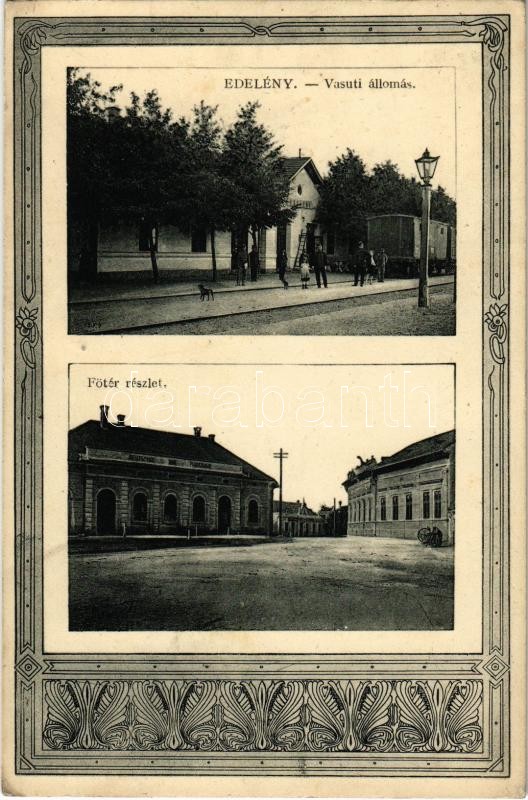 Beschreibung: 1912 Edelény, vasútállomás, vonat, Fő tér, Deutsch Dávid Vám vendéglője. Art Nouveau, Weinstein Márton kiadása (EK)