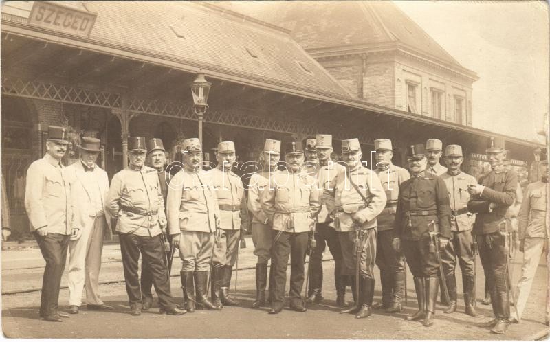 Beschreibung: 1914 Augusztus 17, Szeged, Plank Ede tábornok búcsúztatója elutazásakor a vasútállomáson, magas rangú katonatisztek. photo (EB)