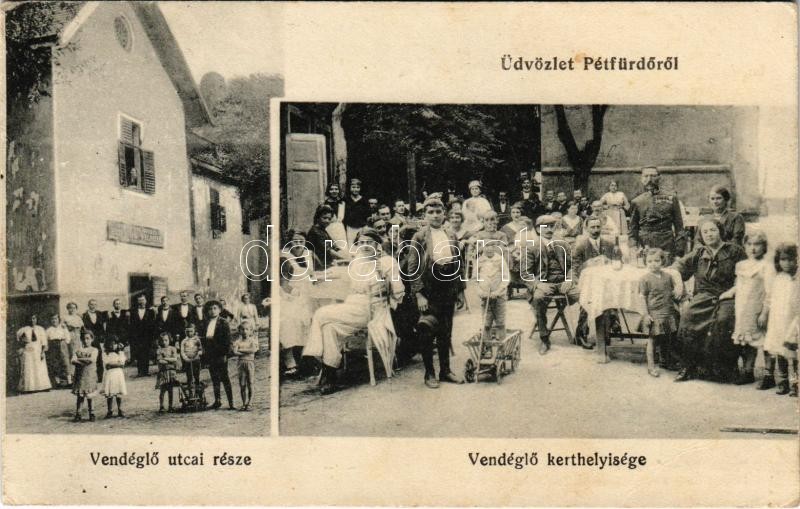 Beschreibung: 1917 Pétfürdő, Hollós Vilmos fürdő vendéglő utcai része és kerthelyiség. Hollós Vilmos saját kiadása, Fekete Zoltán fényk. (EK)