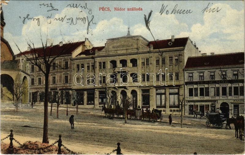 Beschreibung: 1923 Pécs, Nádor szálloda, Stern Mór bazár, Singer varrógépek részvénytársaság, üzlete, lovashintók (EK)