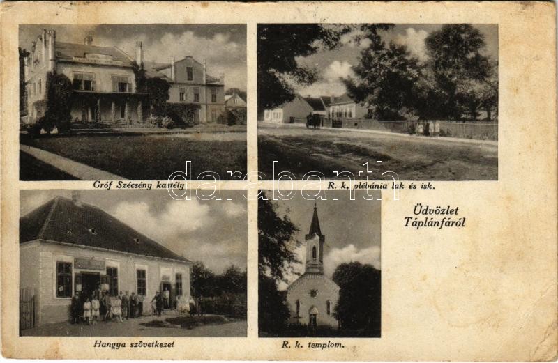 1926 Táplánfa (Táplánszentkereszt), Római katolikus templom, plébánia lak és iskola, Gróf Szécsényi kastély, Hangya szövetkezet üzlete. Haber fényképész kiadása (fa)