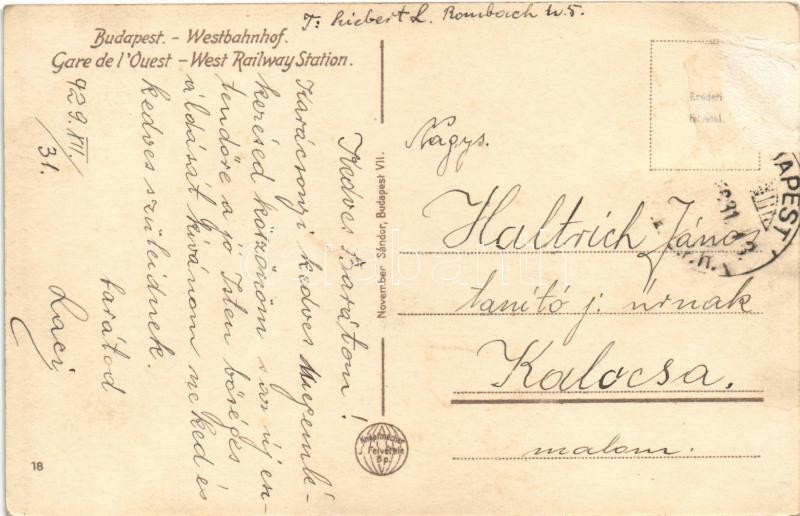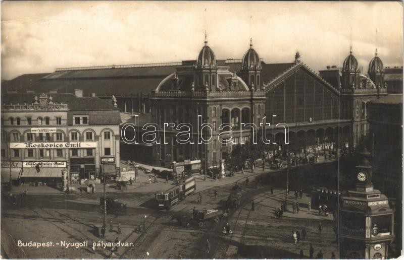 1929 Budapest VI. Nyugati pályaudvar, villamos, Kreutzer László hentesüzlete, Rosenfeld és Bergen fémkereskedése, Moskovics Emil textiláruháza, Westend szálló, Veritas tudakozó, Modiano reklám toronyórán, automobil (Rb)