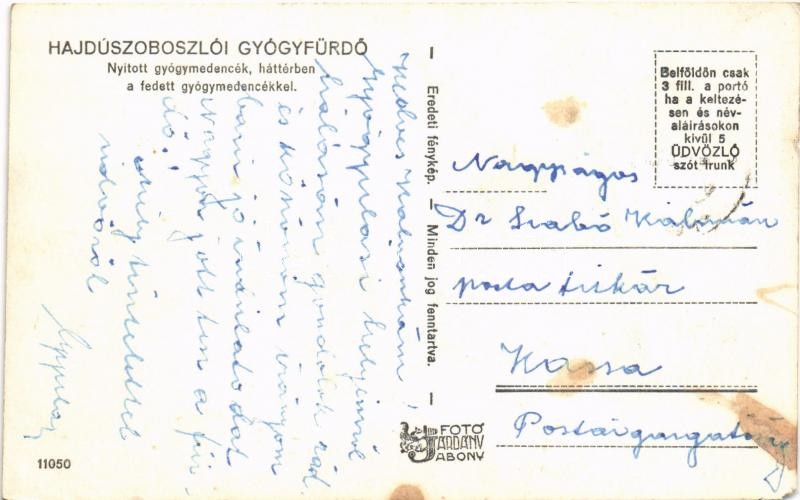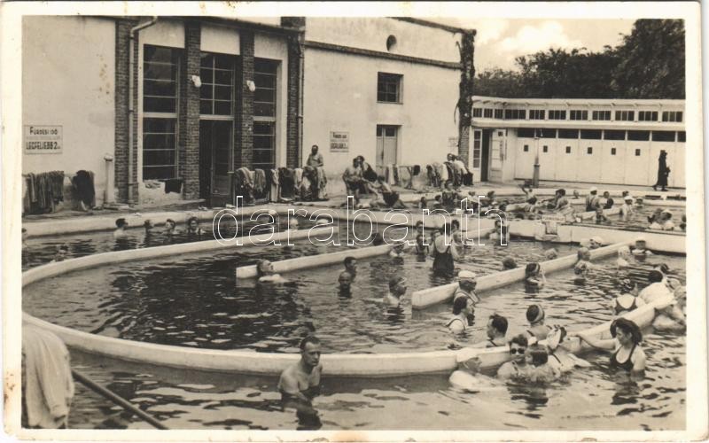 1936 Hajdúszoboszló, Nyitott gyógymedencék, háttérben a fedett gyógymedencékkel, fürdőzők, "Fürdési idő legfeljebb 2 óra" feliratos táblák. Foto Járdány (EM)