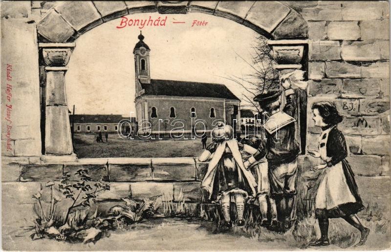 Beschreibung: Bonyhád, Fő tér, templom. Hoffer József kiadása, montázs gyerekekkel (EK)