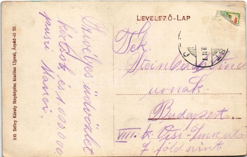Beschreibung: Budapest IV. Újpest, Károly utca, Angyal gyógyszertár, Minta zene iskola, villamos. Selley Károly fényképész kiadása (Rb)