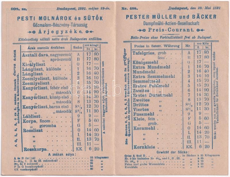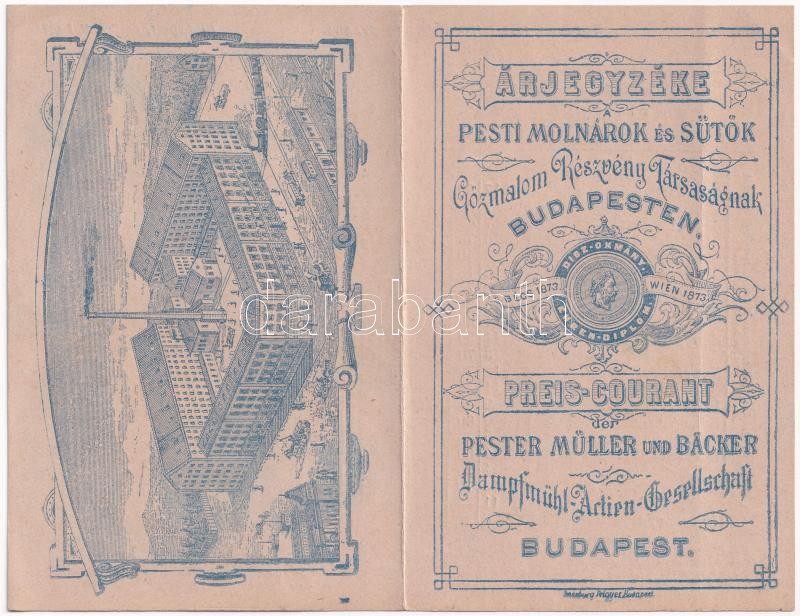 Beschreibung: Budapest IX. Ferencváros, Pesti Molnárok és Sütők Gőzmalom Részvénytársaság a Soroksári úton. Kinyitható reklám árjegyzékkel (non PC)