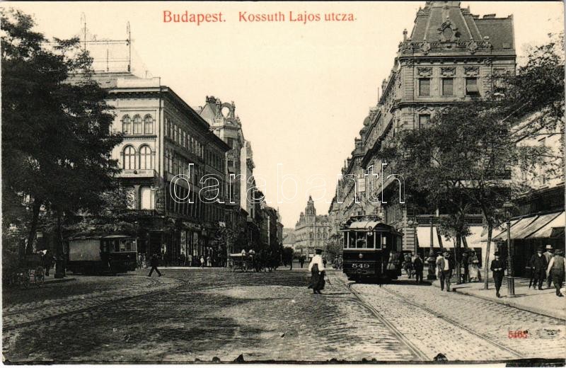 Budapest V. Kossuth Lajos utca, villamosok, üzletek. Taussig A. 5465. https://www.darabanth.com/de/36-Gross-Auktion/36.1/Ansichtskarten/Ungarn~15417/Budapest-V-Kossuth-Lajos-utca-villamosok-uzletek-Taussig-A-5465~II2485915